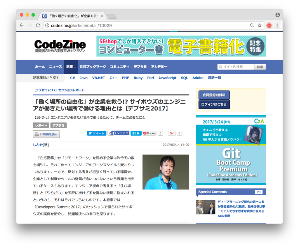 2017-03-14 #devsumi デブサミレポートをCodeZineに寄稿しました:16-D-L『エンジニアが働きたい場所で働けるために、チームに必要なこと』 勉強会 イベント レポート 寄稿 Twitter Google Pocket 先月参加したDevelopers Summit 2017、通称『デブサミ』の寄稿レポート2本目の内容がCodeZineにて公開されましたので当ブログでもお知らせしたいと思います。 寄稿したエントリはこちらです。 「働く場所の自由化」が企業を救う!? サイボウズのエンジニアが働きたい場所で働ける理由とは【デブサミ2017】 (½):CodeZine(コードジン)